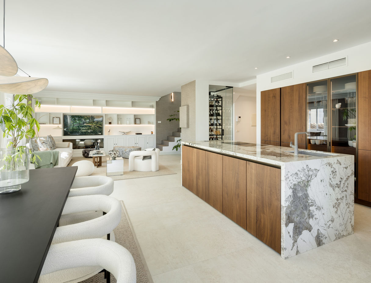 Ubicado en la codiciada zona de la Milla de Oro de Marbella, Costa PH es un excepcional ático dúplex que ofrece vistas panorámicas al mar y a las montañas. Diseñado con un moderno concepto de planta abierta, las áreas de estar, comedor y cocina están conectadas sin interrupciones, creando un ambiente luminoso y espacioso. La cocina de última generación cuenta con una impresionante isla de mármol, elegante mobiliario de madera y electrodomésticos de alta gama integrados, con un elegante estante para vinos que añade a la estética. Las terrazas maximizan la vida al aire libre, presentando una kitchenette con parrilla y un jacuzzi privado para refrescarse mientras se disfrutan de las vistas.